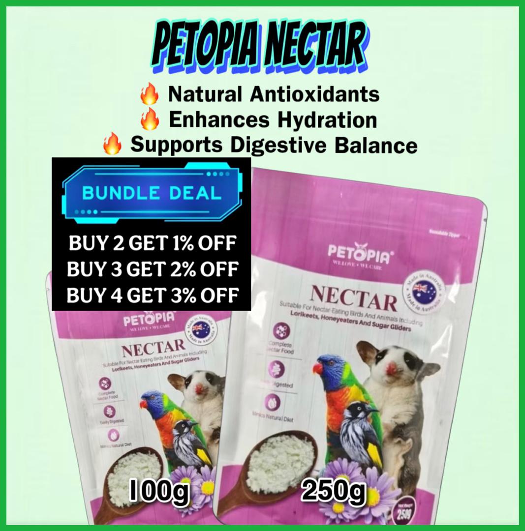 PETOPIA Nectar is an easy to use, nutritionally balanced nectar substitute. It should be fed up to 20% of the diet.
