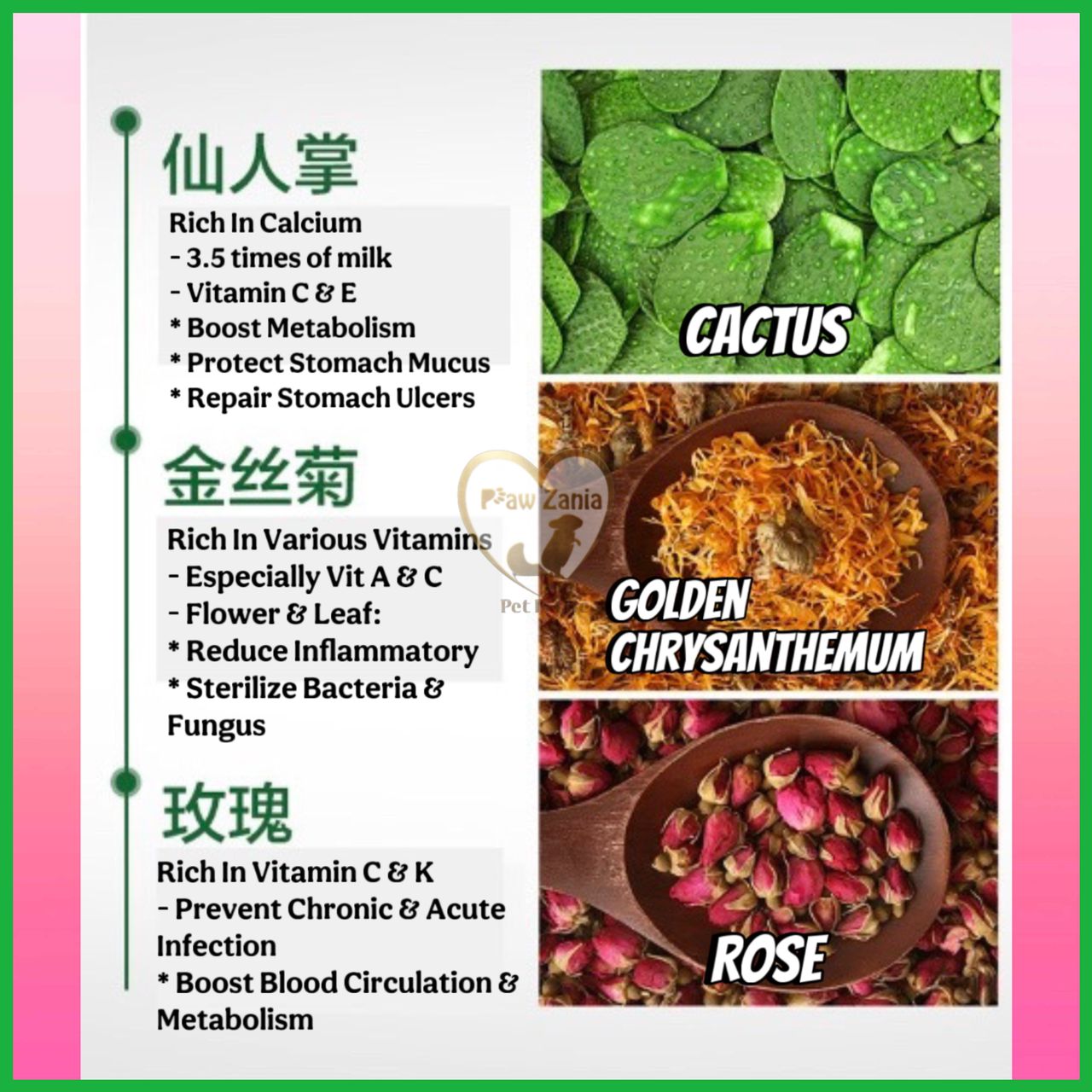 - Chrysanthemum: rich in various vitamins especially A & C. Both flower petals & leaves can reduce inflammatory & sterilize bacteria & fungus