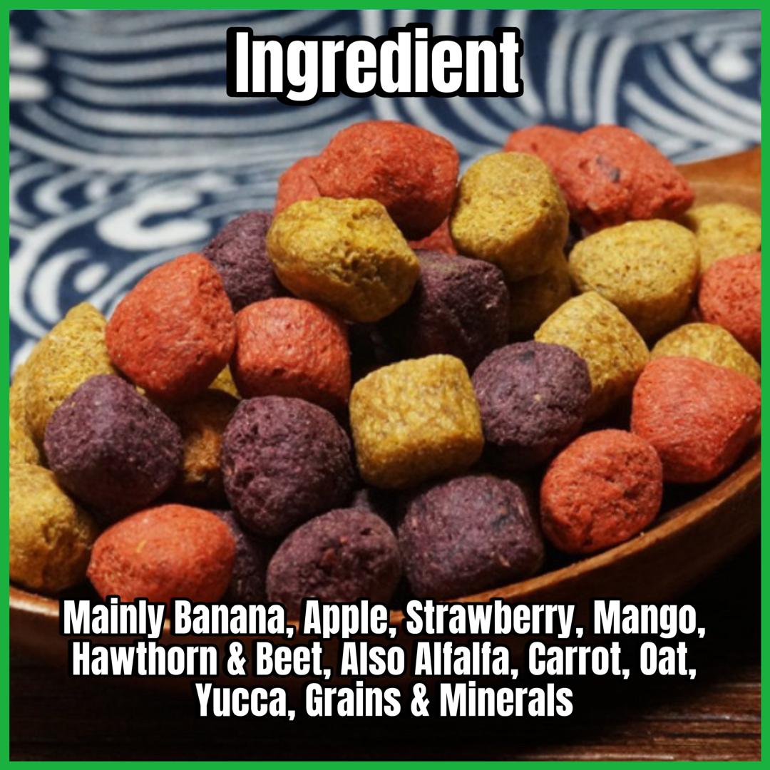 Ingredients: Banana, apple, strawberry, mango, sugar beet, alfalfa, oats, yucca, grain & minerals