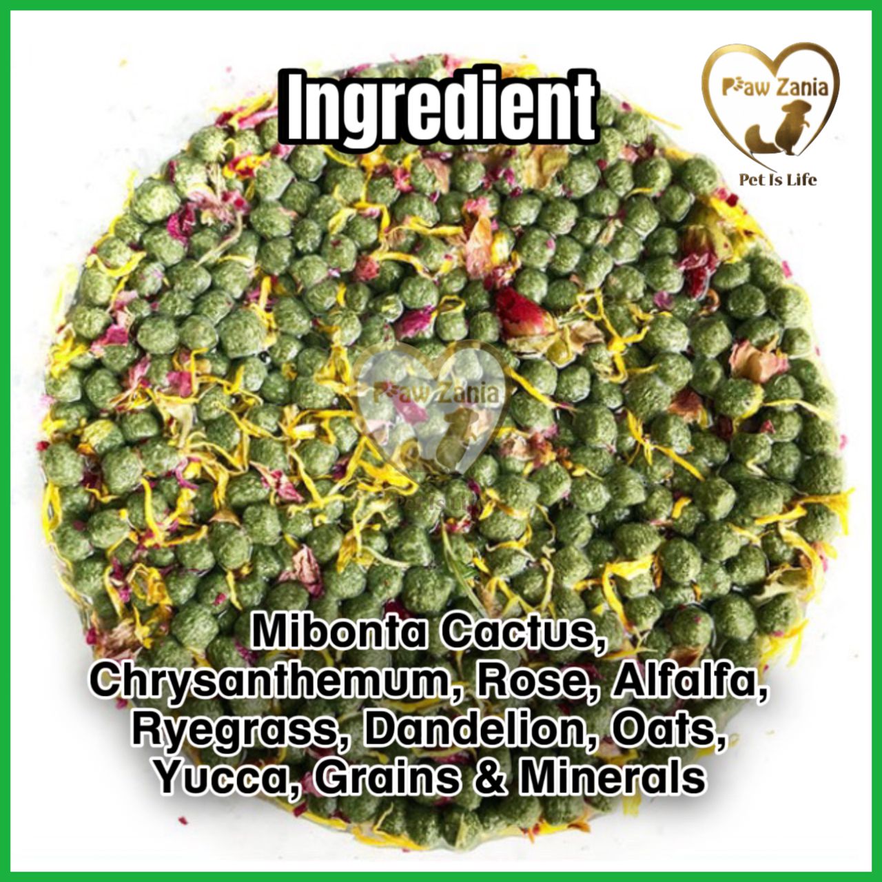 Ingredients: Mibonta cactus (Opium Opuntia), chrysanthemum, rose, alfalfa, ryegrass, dandelion, oats, yucca, grain & minerals