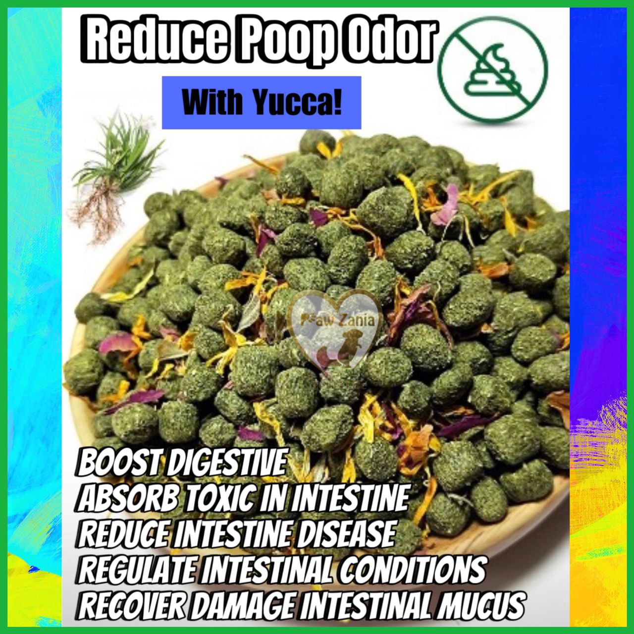 - Reduce poop odor with yucca which absorb toxic in intestine, regulate intestinal conditions, recover damaged intestinal mucus, boost digestion & reduce intestine disease